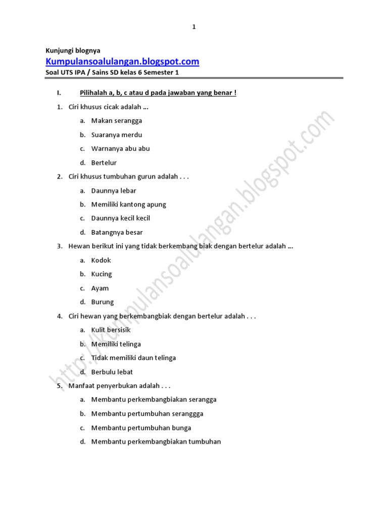 Dilarang mengcopy paste dan mempublish ulang konten dalam. KumpulansoalulanganSD kelas 6 soal ipa kelas 6 Semester 1 uts ganjil Soal Latihan UTS IPA Kelas 6 Semester 1 Ganjil KTSP. Demikianlah Soal UTS IPA Kelas 6 Semester 1 plus Kunci Jawaban yang bisa saya bagikan.