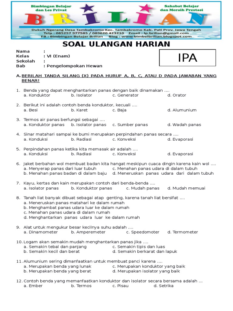 Soal Ulangan Harian IV - IPA Konduktor dan Isolator Materi Pokok. IPA Kelas 6 SD BAB 5 Latihan Soal Konduktor dan Isolator Panas IPA Kelas 6 Kunci Jawaban Comments There are currently no comments. Pembelajaran Jarak JauhMs.